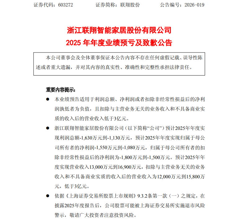 2026年年初,聯(lián)翔股份基于已獲取的信息測(cè)算,初步預(yù)計(jì)2025年度經(jīng)營業(yè)績(jī)未在業(yè)績(jī)預(yù)告披露范圍內(nèi),因此,公司未在2026年1月底之前披露2025年度業(yè)績(jī)預(yù)告。